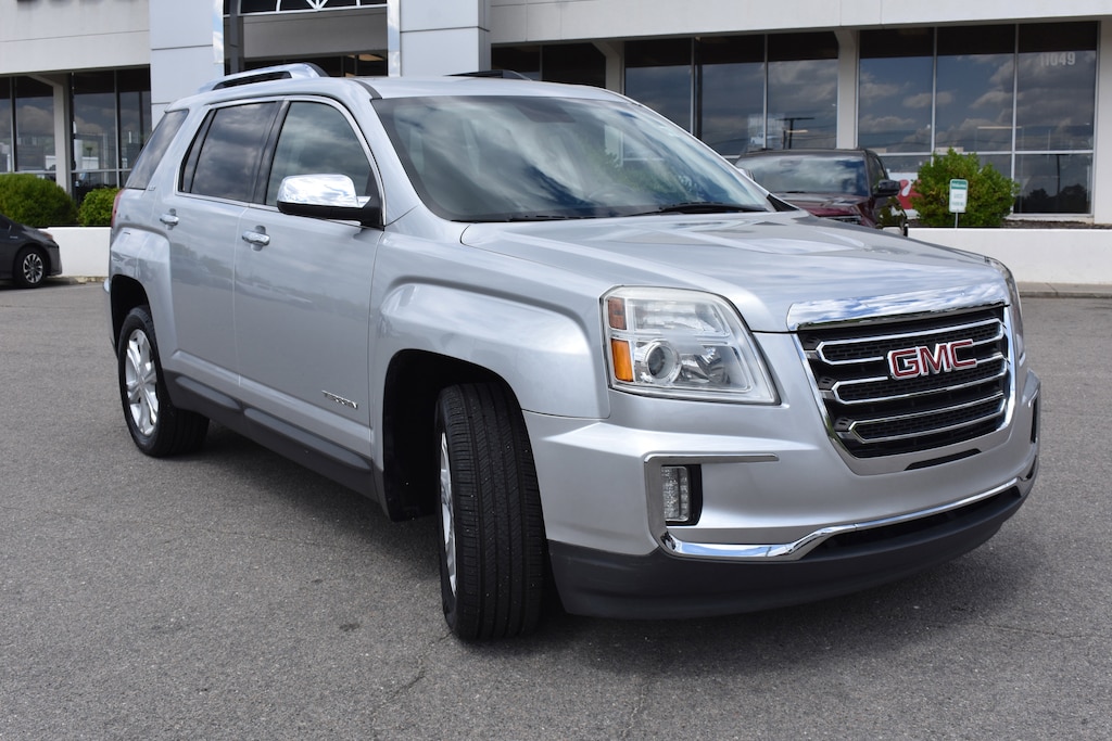 Quicksilver Metallic 2016 GMC Terrain SLT FWD 6-Speed Automatic 3.6L V6 DGI DOHC VVT 155 Amp Alternator, 2.77 Axle Ratio, 4-Wheel Disc Brakes, 8 Speakers, 8-Way Power Driver Seat Adjuster, ABS brakes, Air Conditioning, Alloy wheels, AM/FM radio: SiriusXM, Auto-dimming Rear-View mirror, Automatic temperature control, Brake assist, Bumpers: body-color, Chrome Luggage Rails, Chrome Power-Adjustable Heated Outside Mirrors, Compass, Delay-off headlights, Dual Exhaust w/Premium Tips, Dual front impact airbags, Dual front side impact airbags, E10 Fuel Capable, Electronic Stability Control, Emergency communication system, Exterior Parking Camera Rear, Four wheel independent suspension, Front anti-roll bar, Fully automatic headlights, Heated door mirrors, Heated Driver & Front Passenger Seats, Heated front seats, Illuminated entry, Intellilink w/Bluetooth, Low tire pressure warning, Occupant sensing airbag, Outside temperature display, Overhead airbag, Panic alarm, Perforated Leather-Appointed Seat Trim, Pioneer Premium 8-Speaker System, Power door mirrors, Power driver seat, Power steering, Power windows, Preferred Equipment Group 4SA, Radio data system, Radio: Color Touch AM/FM Stereo, Rear anti-roll bar, Rear window defroster, Rear window wiper, Remote keyless entry, Remote Vehicle Start, Roof rack: rails only, Security system, Single-Zone Automatic Climate Control, SiriusXM Satellite Radio, Speed control, Speed-sensing steering, Split folding rear seat, Spoiler, Steering wheel mounted audio controls, Tachometer, Telescoping steering wheel, Tilt steering wheel, Traction control, Trip computer, Variably intermittent wipers, Wheels: 18" x 7" Aluminum (4).