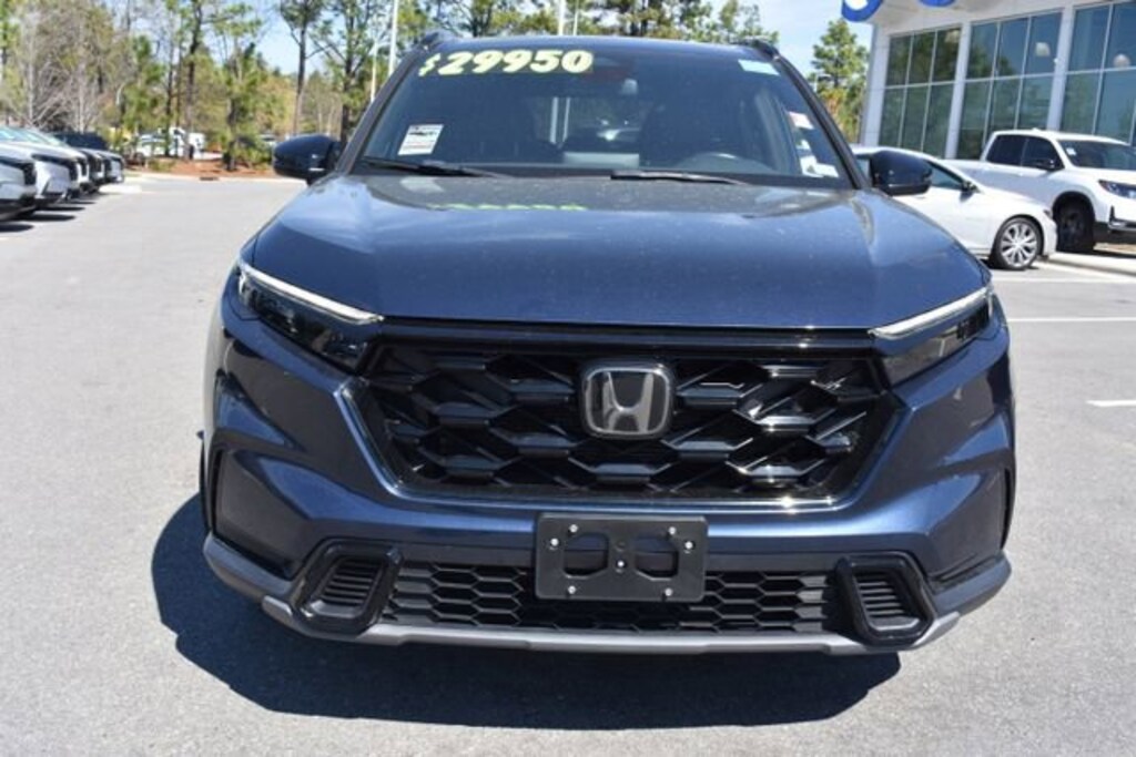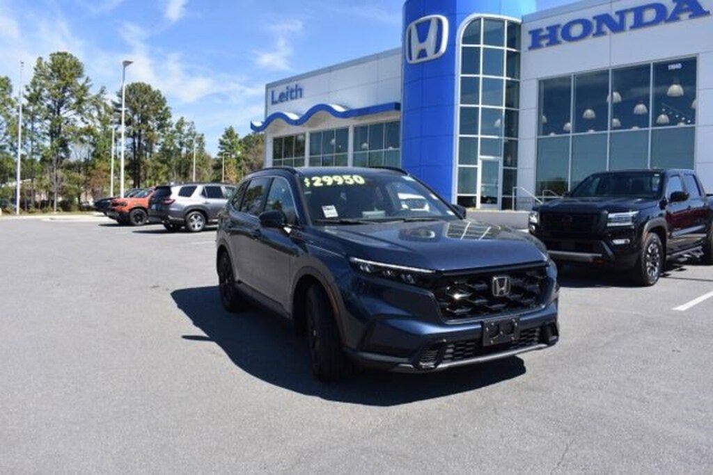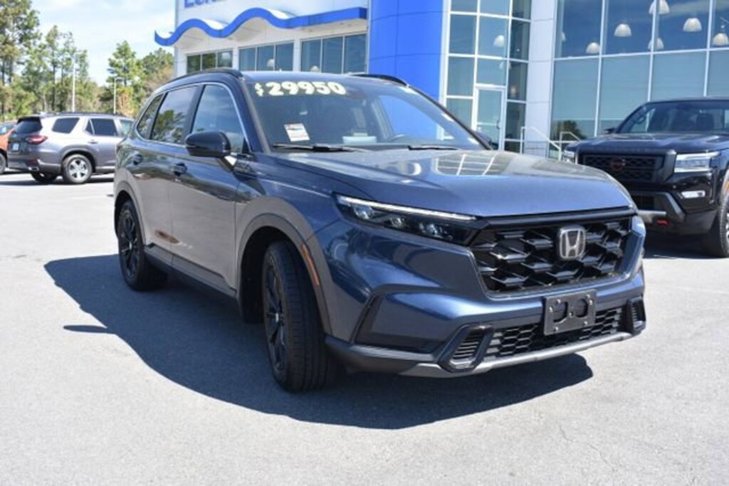Canyon River Blue Metallic 2023 Honda CR-V Hybrid Sport FWD 2.0L I4 DOHC 16V 2.0L I4 DOHC 16V, 4-Wheel Disc Brakes, 4.438 Axle Ratio, 6 Speakers, ABS brakes, Adaptive Cruise Control: Adaptive Cruise Control (ACC) with Low-Speed Follow, Air Conditioning, Alloy wheels, Apple CarPlay/Android Auto, Auto High-beam Headlights, Automatic temperature control, Brake assist, Bumpers: body-color, Cloth Seat Trim, Compass, Delay-off headlights, Dual front impact airbags, Dual front side impact airbags, Electronic Stability Control, Exterior Parking Camera Rear, Four wheel independent suspension, Front anti-roll bar, Front dual zone A/C, Fully automatic headlights, Heated door mirrors, Heated Front Bucket Seats, Heated front seats, Illuminated entry, Knee airbag, Leather Shift Knob, Leather steering wheel, Low tire pressure warning, Occupant sensing airbag, Outside temperature display, Overhead airbag, Panic alarm, Power door mirrors, Power driver seat, Power moonroof, Power steering, Power windows, Radio data system, Radio: 240-Watt AM/FM Audio System, Rear anti-roll bar, Rear side impact airbag, Rear window defroster, Rear window wiper, Remote keyless entry, Security system, Speed control, Speed-sensing steering, Speed-Sensitive Wipers, Split folding rear seat, Spoiler, Steering wheel mounted audio controls, Telescoping steering wheel, Tilt steering wheel, Traction control, Trip computer, Turn signal indicator mirrors, Variably intermittent wipers, Wheels: 18" Berlina Black Alloy.